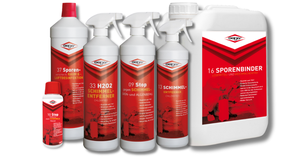 Die Beseitigung des Schimmelbefalls durch Fachbetriebe erfordert den Einsatz von Produkten, die von der Bundesanstalt für Arbeitsschutz und Arbeitsmedizin (BAuA) als Biozid zugelassen sind. Die intensive und nachhaltige Wirkung der aufeinander abgestimmten Profi-Produkte der Marke Geiger Chemie trägt maßgeblich zum Erfolg bei Schimmelsanierung bei.